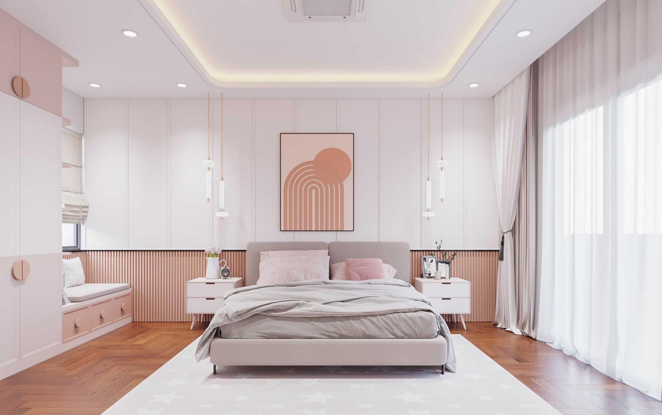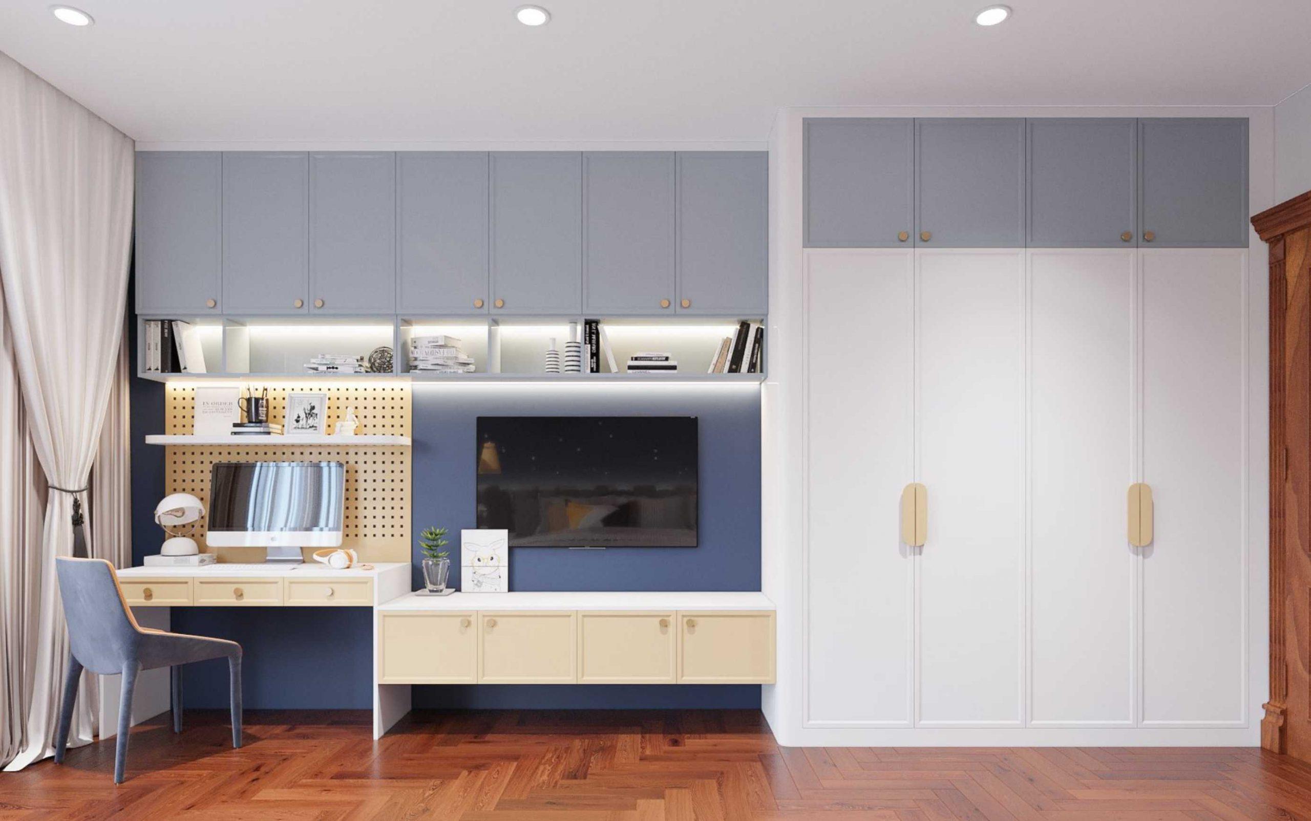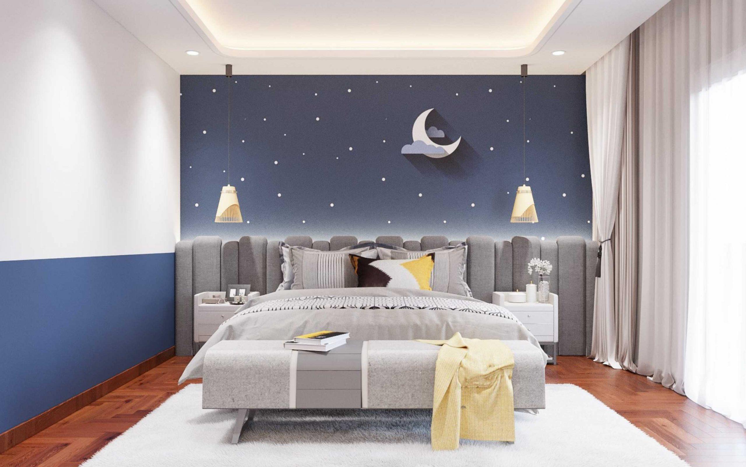Không gian phòng ngủ con sử dụng vật liệu gỗ Sồi kết hợp màu sắc Sơn tạo cảm giác Trẻ trung và Thư giãn.